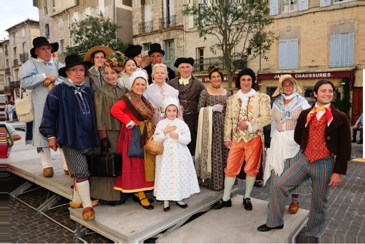 Après le défilé en ville des quelques 140 participants en costumes et robes d’époques, les costumes de tradition ont été présentés sur le podium. Un public nombreux a pu ainsi découvrir particularités et similitudes des habits portés en Languedoc, Provence et Catalogne de 1760 à 1910.